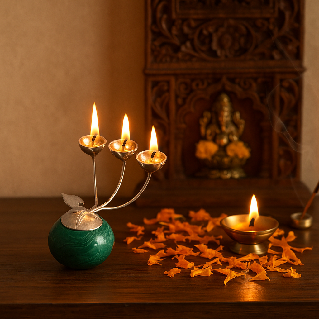 Three graceful silver bowls rise from a malachite base like blooming vines in the Dancing Vines Stand. Designed for serving nuts, dry fruits, or mouth fresheners with panache.