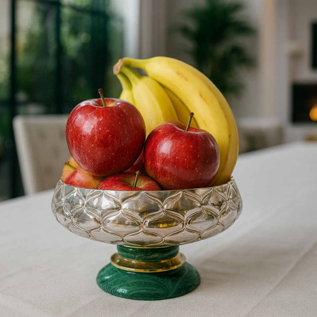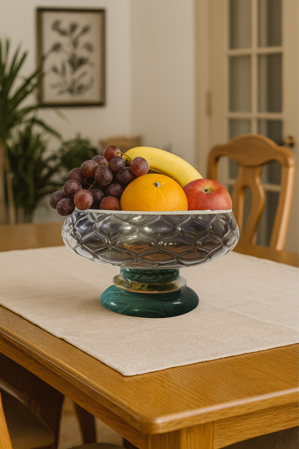The Emerald Luxe Bowl features a quilted honeycomb exterior with a golden rim and deep green pedestal. A bold blend of art and opulence, made for festive indulgence.