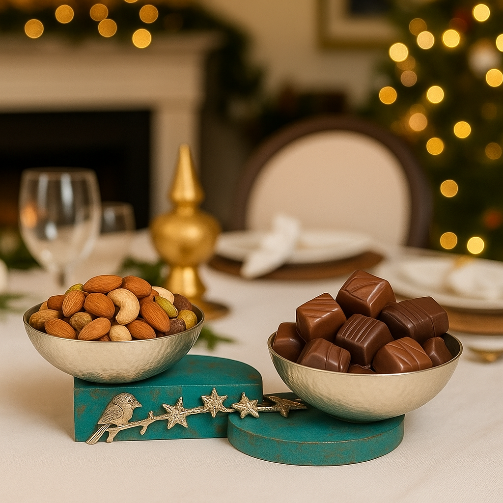 Two silver hammered bowls rest gracefully on textured turquoise blocks, connected by a silver floral vine. The Floral Symphony Set brings nature’s elegance into contemporary serveware.