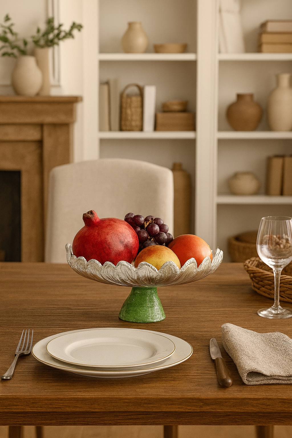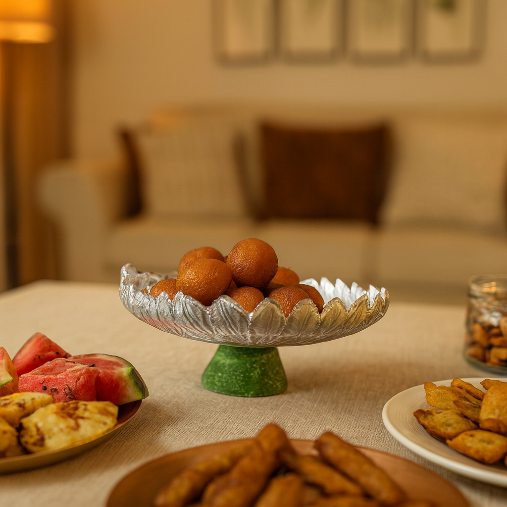 Smaller in scale, mighty in charm—the Forest Crown Bowl features delicate silver leaves on a vibrant green pedestal. Perfect for gifting or accenting side tables with botanical grace.