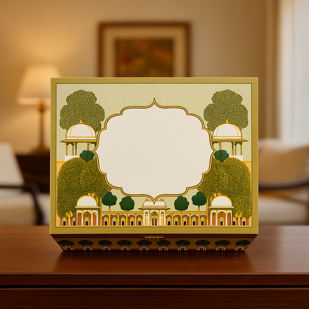 An elegantly crafted invitation box inspired by Mughal architecture, featuring intricate artwork of lush trees and royal pavilions. The soft olive-green palette, gold satin lining, and a customizable frame make it an ideal choice for wedding invitations, luxury gifting, and special celebrations.
