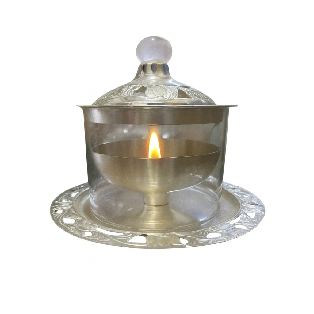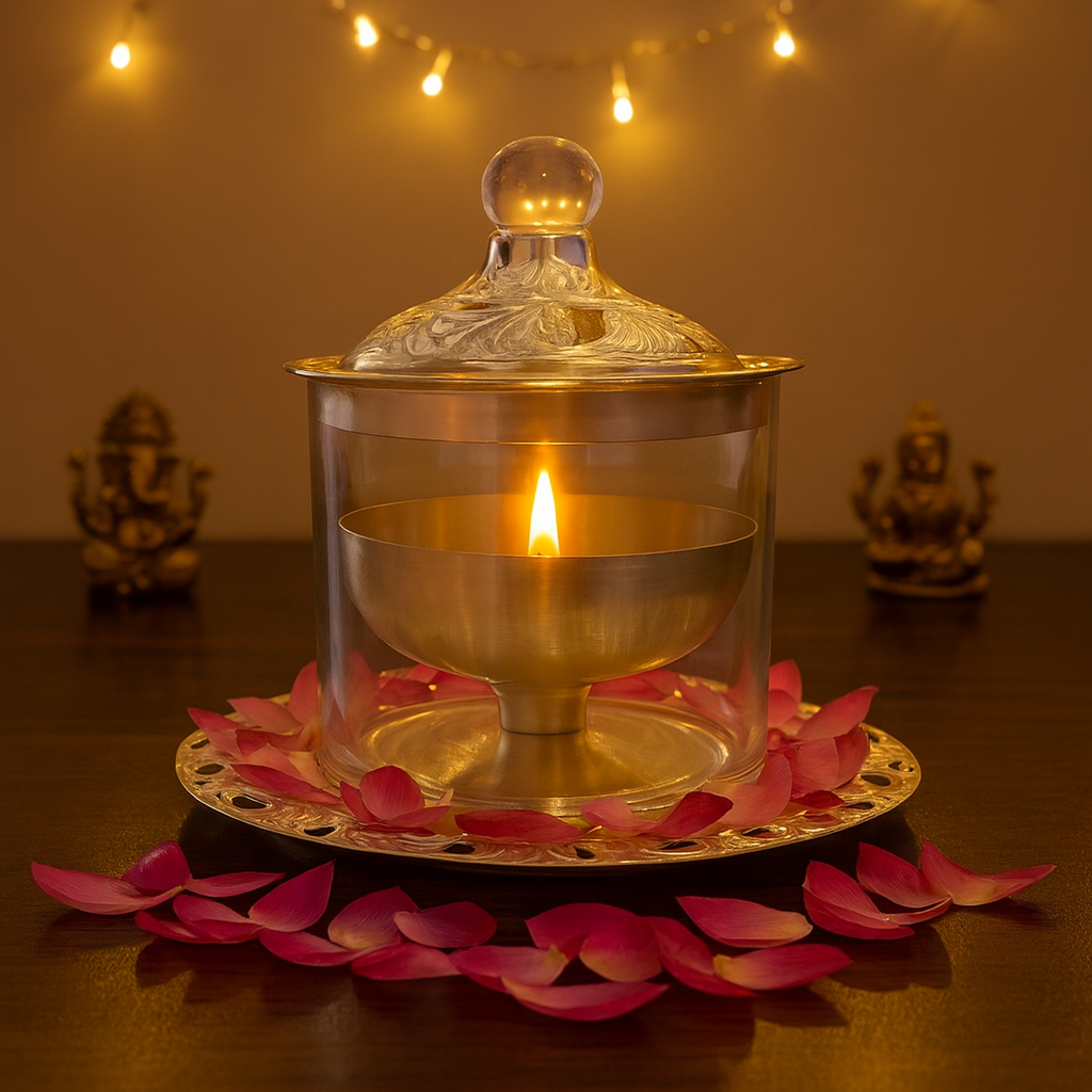 Encased in clear crystal and topped with a rose quartz knob, this intricately crafted silver vessel is ideal for storing prasad or sweets with divine charm.