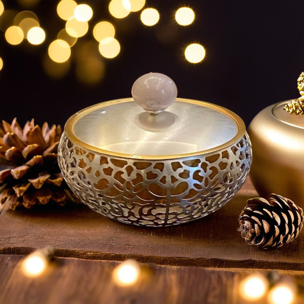 The Jaali Luxe Jar blends traditional jaali artistry with modern elegance. With a rose quartz finial and golden-rimmed detailing, it’s perfect for storing dry fruits, spices, or trinkets in style.