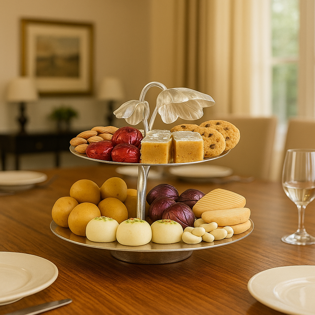 A poetic two-tier silver platter, the Orchid Cascade is adorned with handcrafted blooming flowers. Ideal for mithai, cupcakes, or fruit, it turns every table into an enchanted garden.