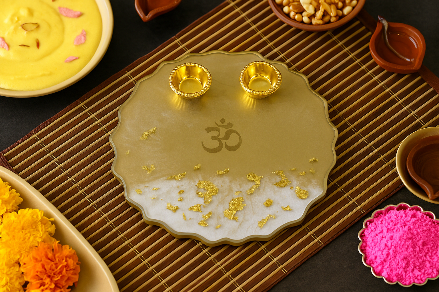 Our Resin Pooja Thali combines elegance and functionality, crafted to enhance your spiritual rituals. Made with high-quality resin, each thali is uniquely designed with intricate patterns, vibrant colors, and a glossy finish. Perfect for any occasion, it holds your essentials like diya, incense, and offerings while adding a touch of luxury to your pooja setup. Customize your thali to reflect your personal style or to gift a loved one