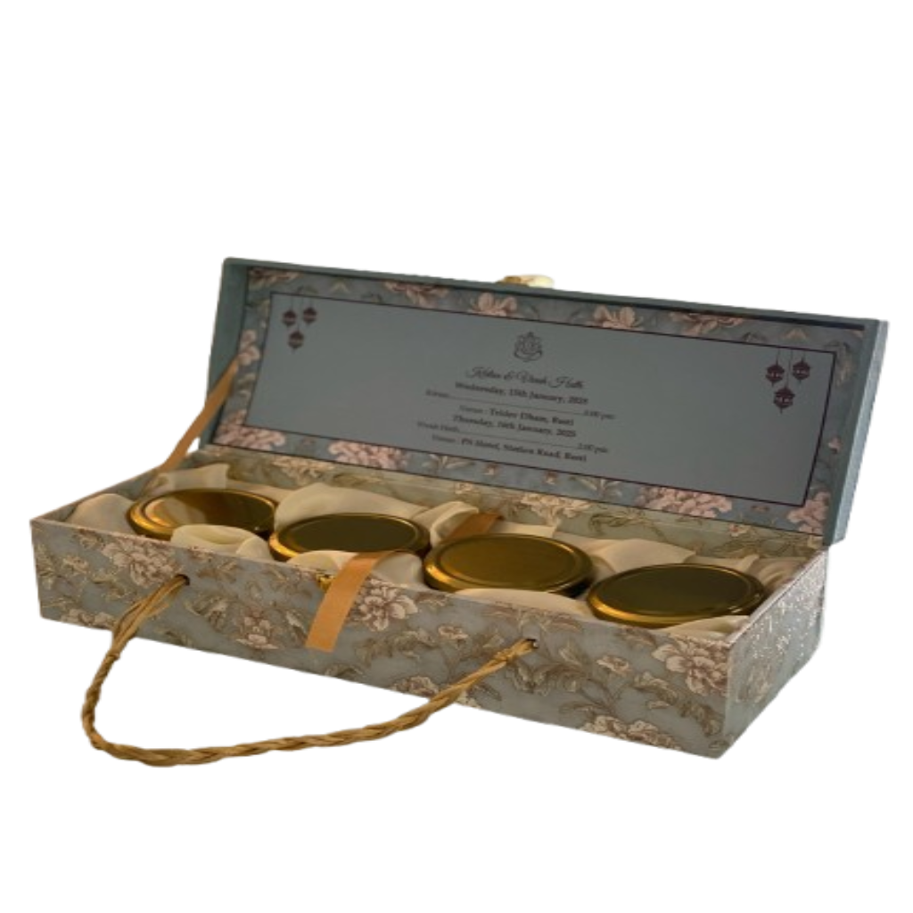 This is a Luxury Floral Wedding Invitation Hamper with an elegant pastel-colored floral design. The box features a sophisticated printed invitation on the inside lid, detailing the wedding events in a refined layout. The main compartment holds four beautifully arranged jars with golden lids, likely containing sweets, dry fruits, or other traditional gifts. The braided golden handle adds a luxurious and easy-to-carry touch, making it both a stylish and practical invitation.