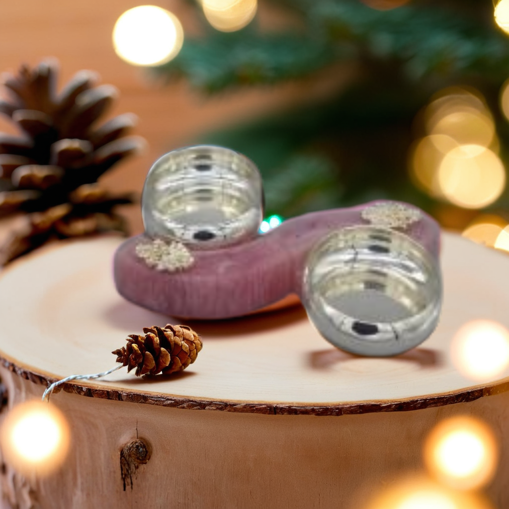 The Rosy Orbit Set features two gleaming silver bowls seated on a blush pink organic base, accented with delicate floral motifs. Ideal for mithai, dips, or luxe gifting hampers.