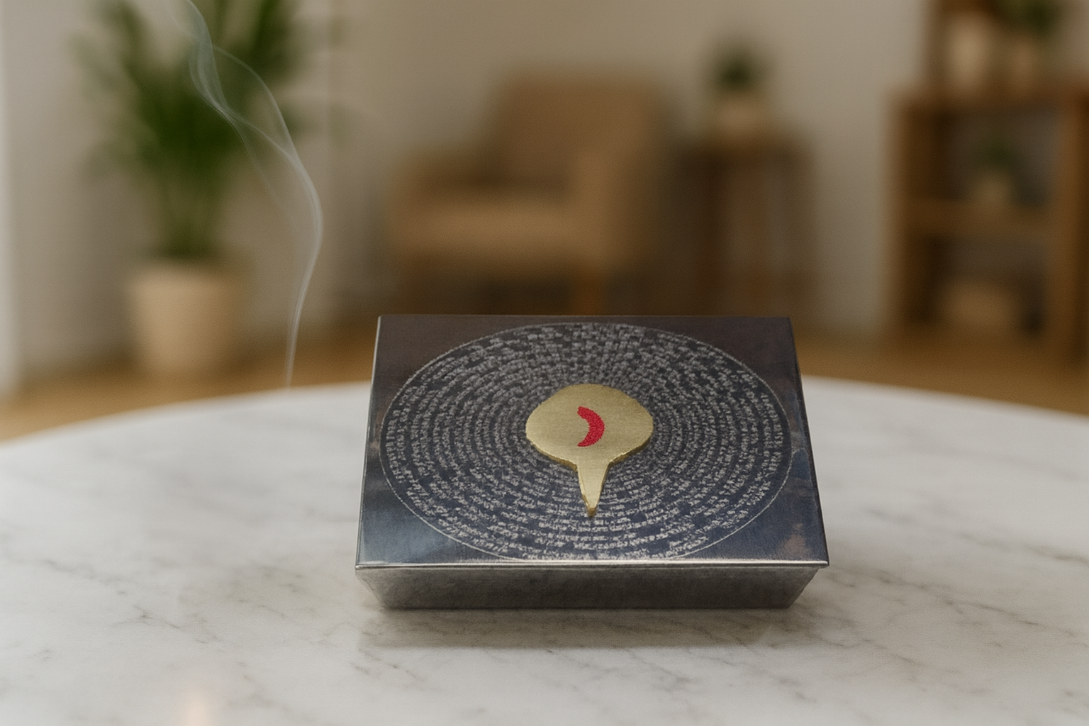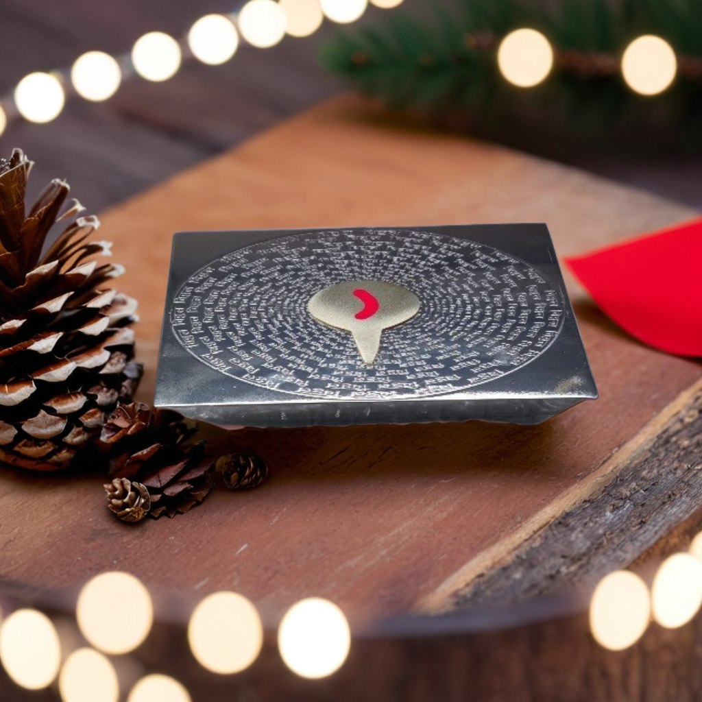 The Trinetra Mantra Box showcases a circular chant in sacred Devanagari script, converging toward a symbolic trinetra (third eye) motif. A perfect union of spiritual design and meaningful presentation.