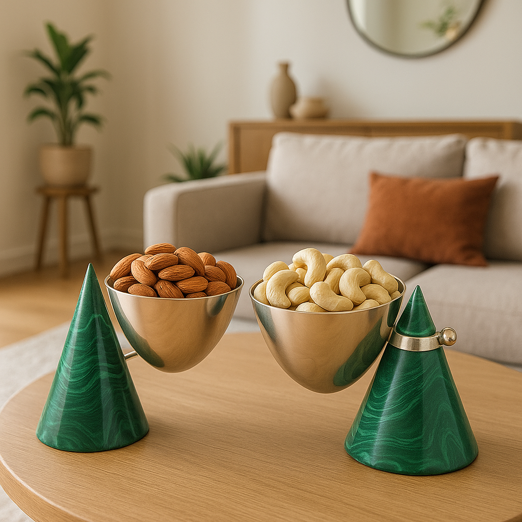 Modern minimalism meets timeless appeal in the Trio Cone Server Set. Three polished silver bowls nest seamlessly into green marble-textured conical bases—ideal for serving snacks, dry fruits, or condiments with flair.